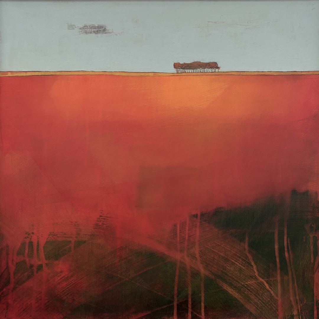 Johnshaven, surrounded by land and sea; trees, fields, clouds and waves, is an exciting environment to live and work. Using sketches and memories to gather information from the fleeting moments in a journey, Morag creates a visual memory on board, layering the paint and scraping back revealing underlying colour and texture.