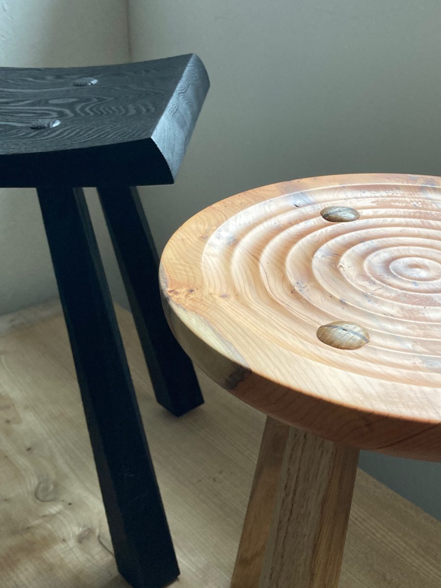A stool in Oak, shaped to fit and balance, legs jointed through, blackened and scorched in fire.