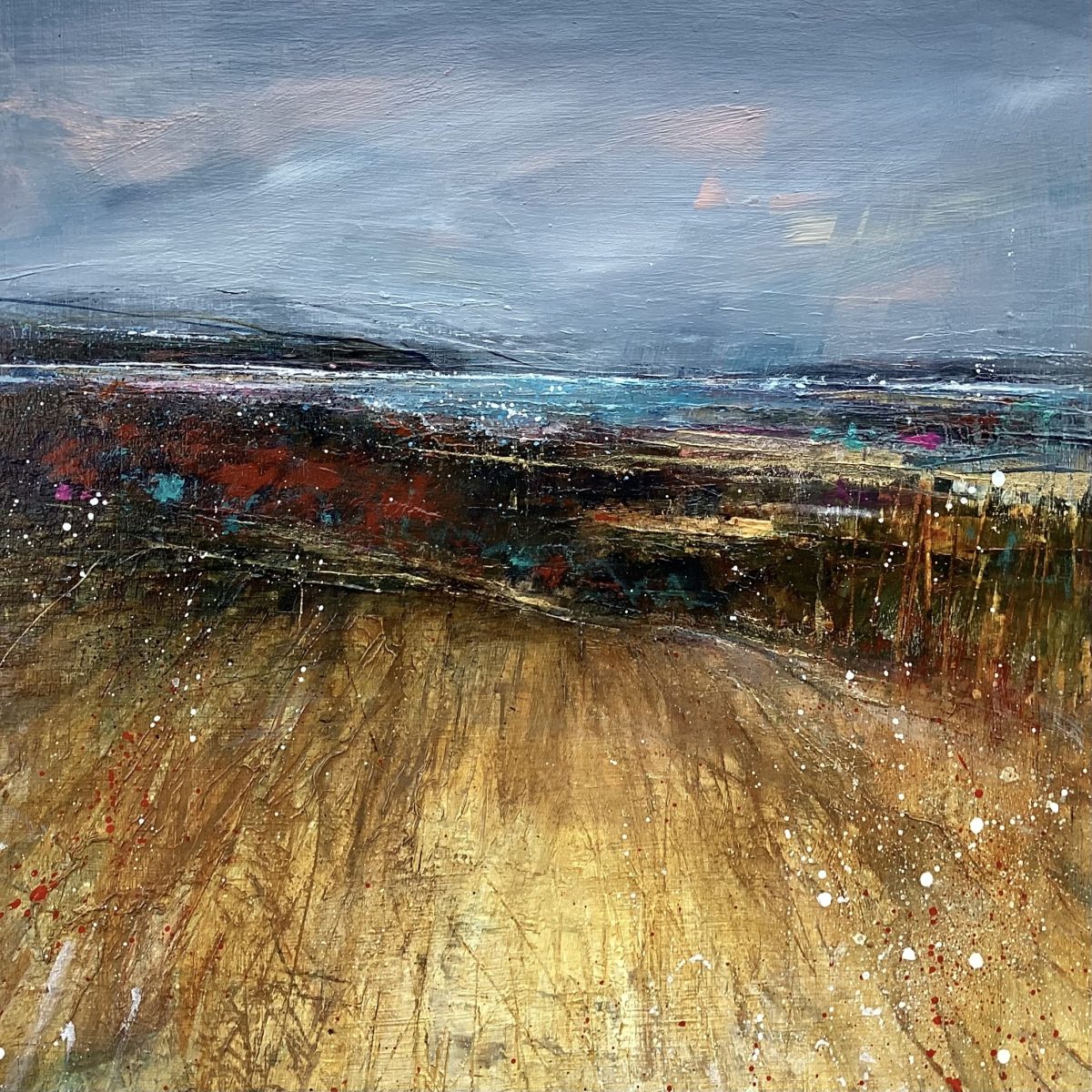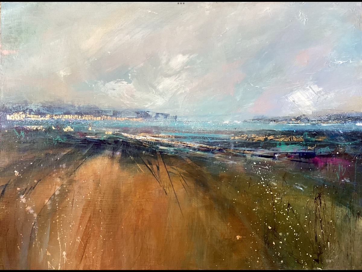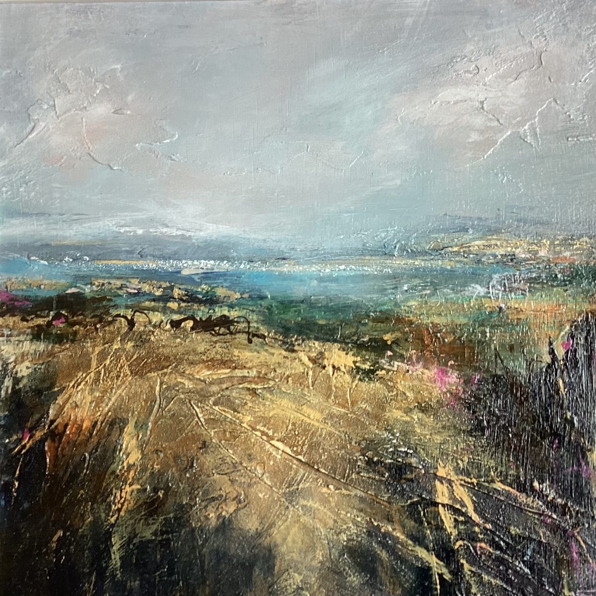 Welcome to my hillside studio overlooking Findhorn Bay and the Moray Firth. Inspired by local landscapes and seascapes, I love experimenting with expressive mark making. Using a wide range of media, including acrylic, ink, crayon and watercolour, I scrape through layers, splatter fluid paint, add texture with crackle paste, and shimmer with gold leaf.