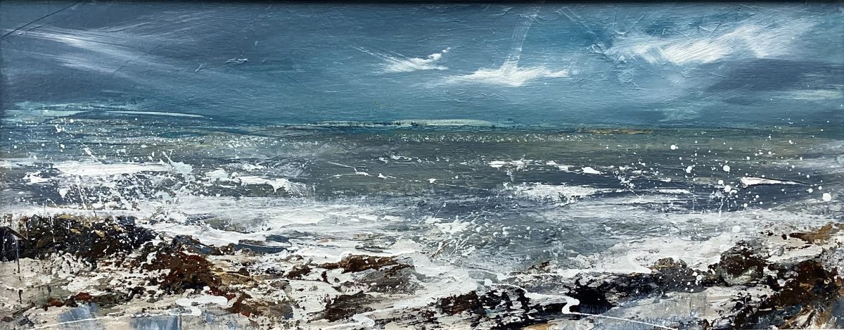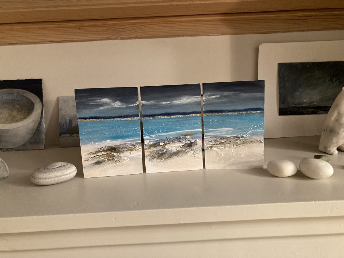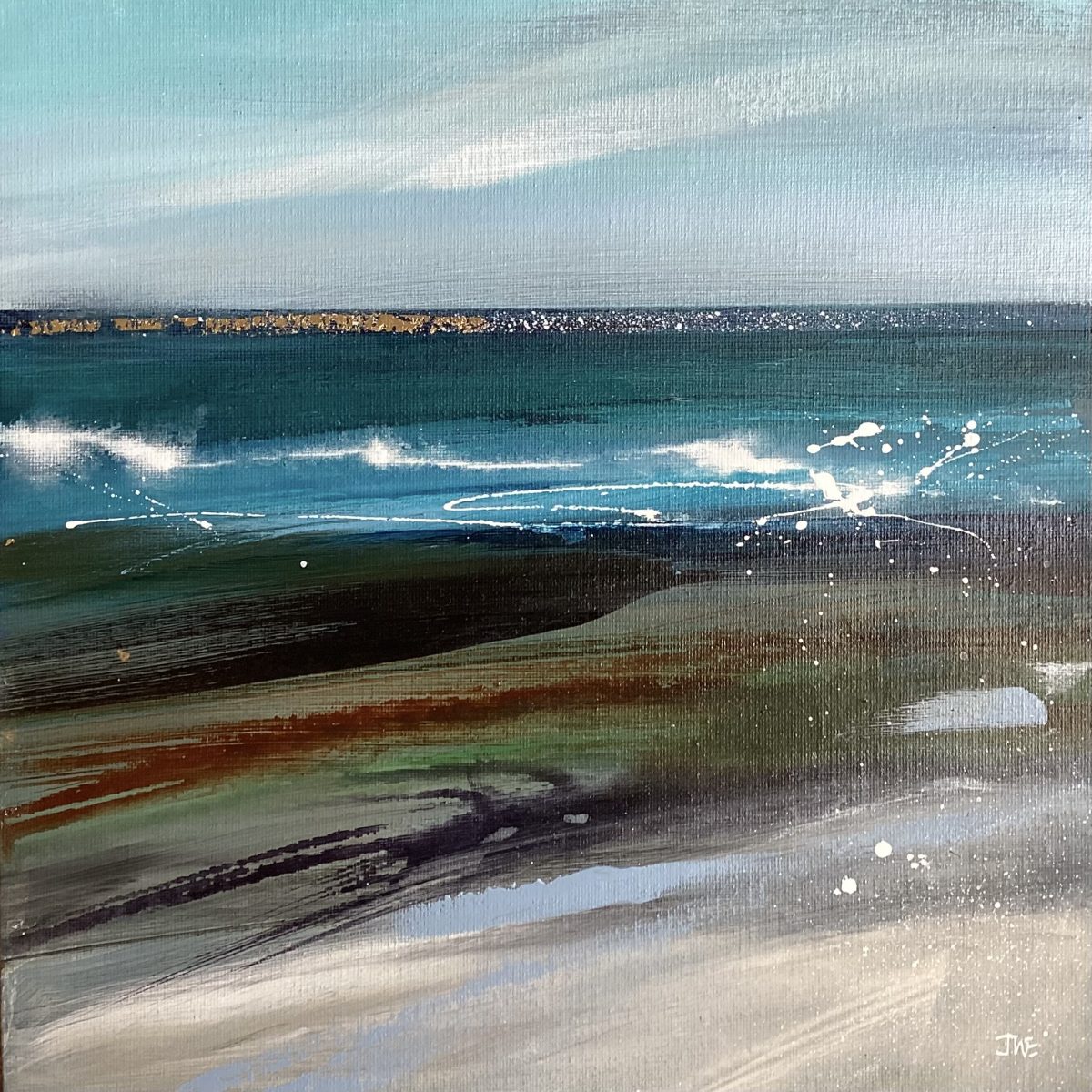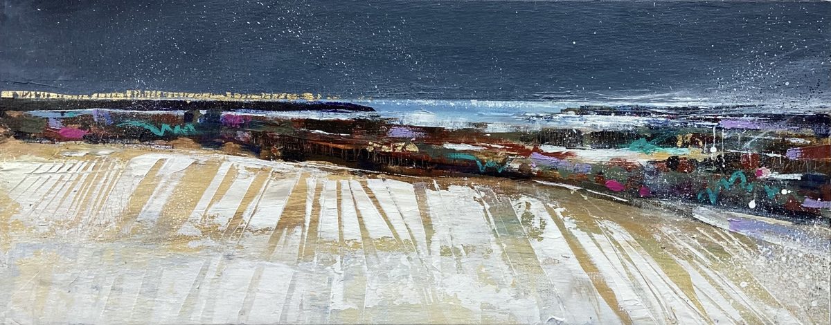 Welcome to my hillside studio overlooking Findhorn Bay and the Moray Firth. Inspired by local landscapes and seascapes, I love experimenting with expressive mark making. Using a wide range of media, including acrylic, ink, crayon and watercolour, I scrape through layers, splatter fluid paint, add texture with crackle paste, and shimmer with gold leaf.
