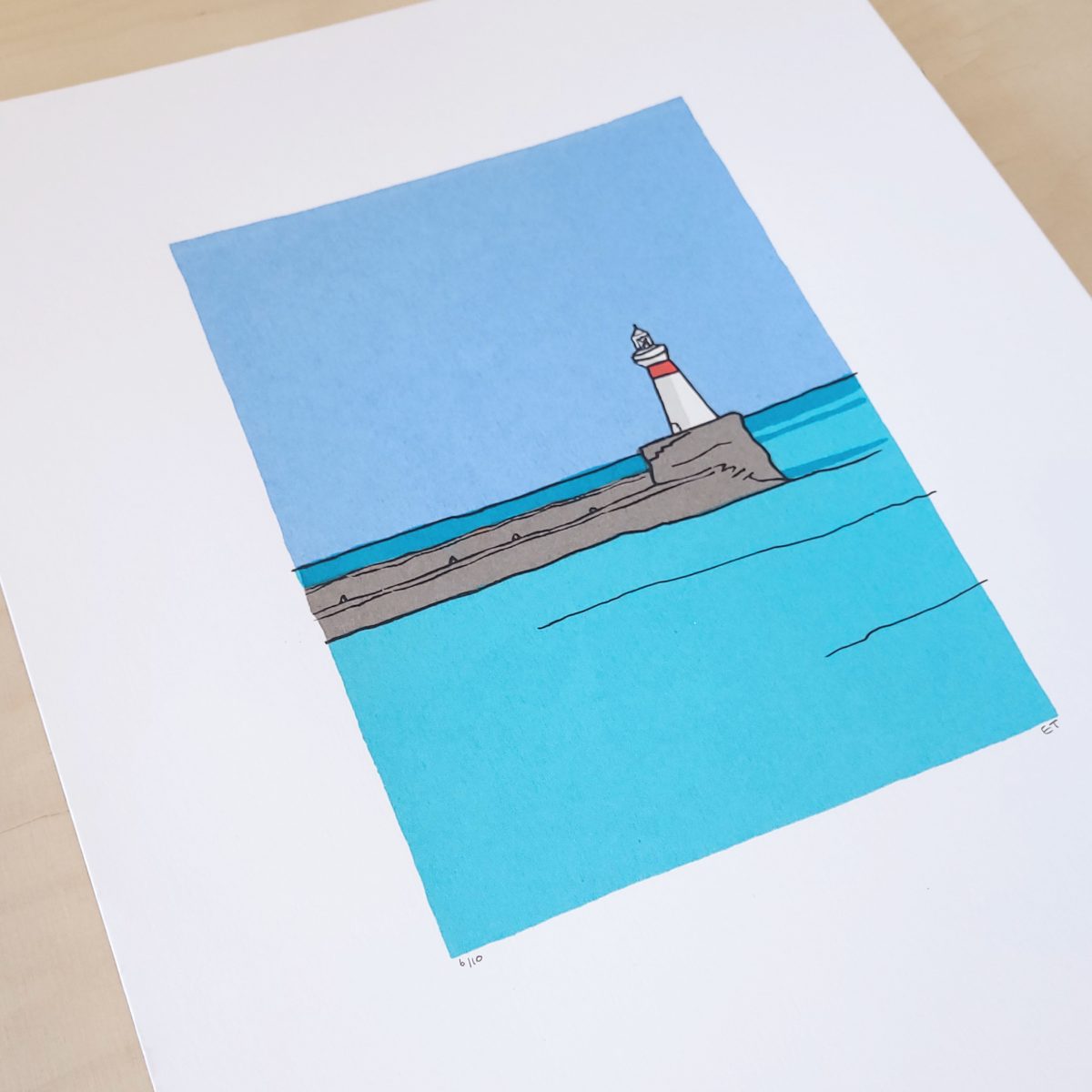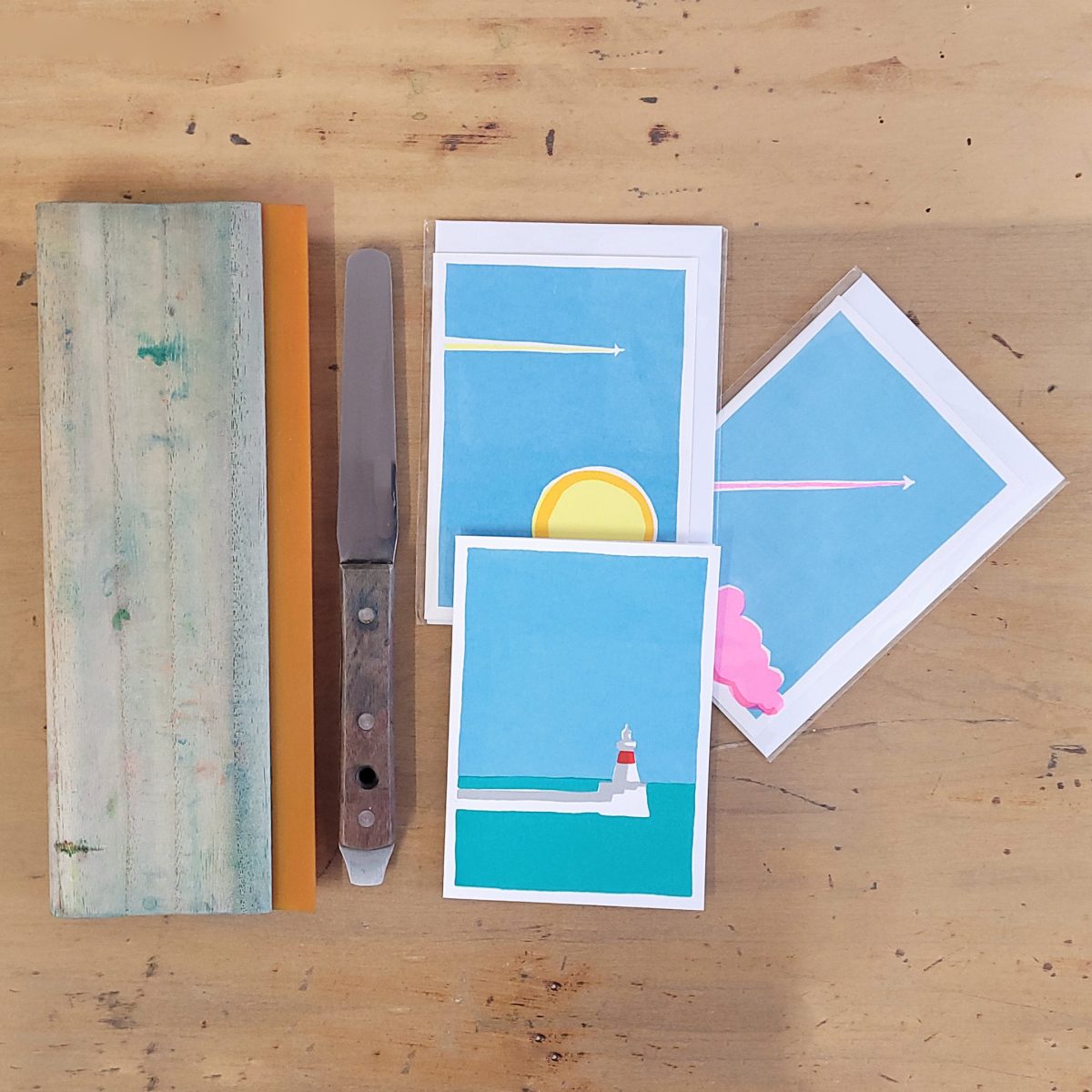 I create work that I hope makes people smile and evokes a memory; I love bright, bold colour and use this to bring my linear drawings or photographs to life. The surrounding sea and landscapes of the northeast are my main inspiration. I typically work with silk screen and risograph printing techniques, which perfectly suit my illustrative work style.